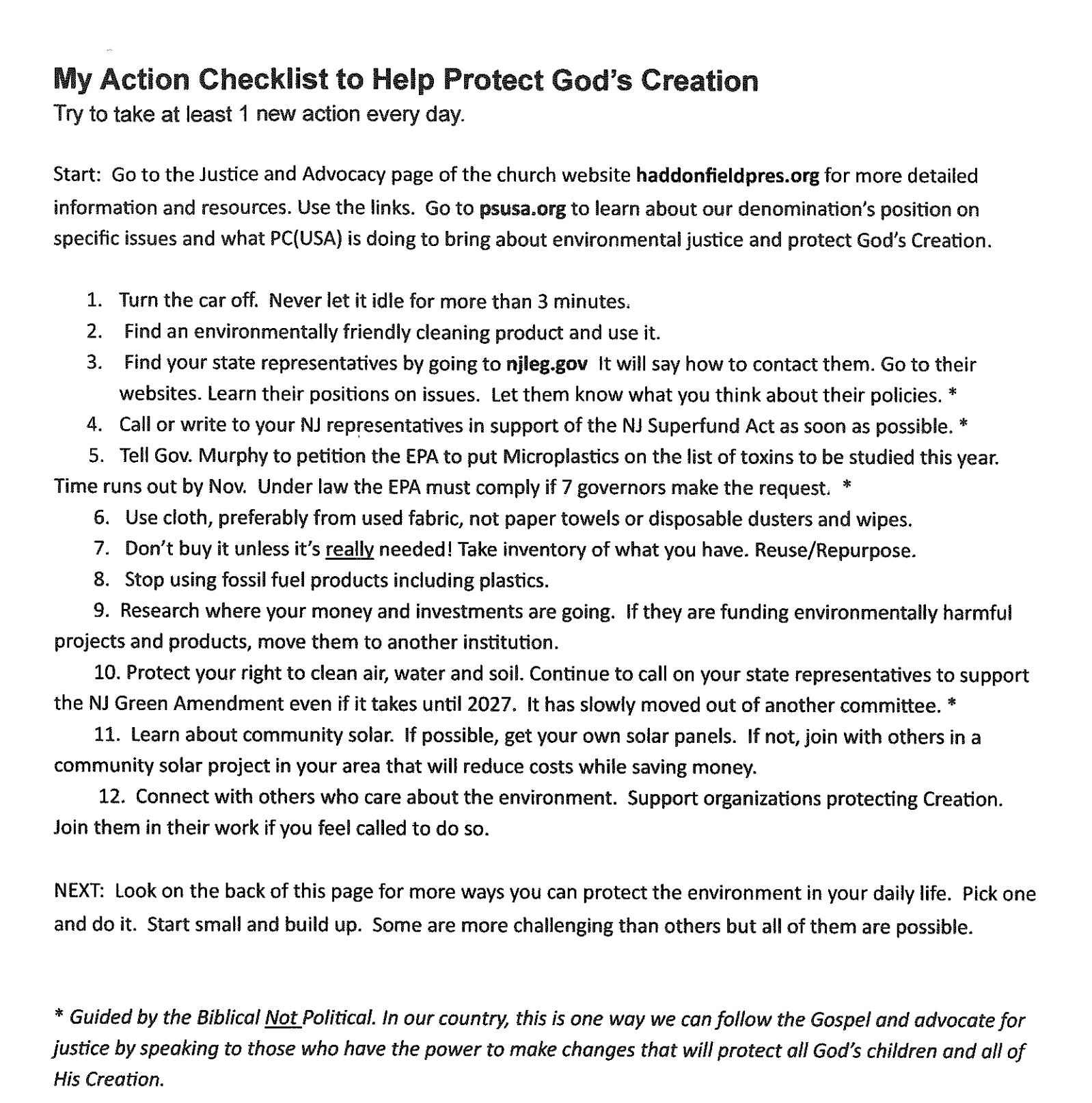 Every person has a right to a clean and healthy environment. JAC urges you to contact your state representatives to urge them to support the NJ Green Amendment and press to have it brought up for hearings with public input. See the resources linked here and njgreenamendment.org. or see how to contact your state representatives under the Voting Rights tab on this webpage.