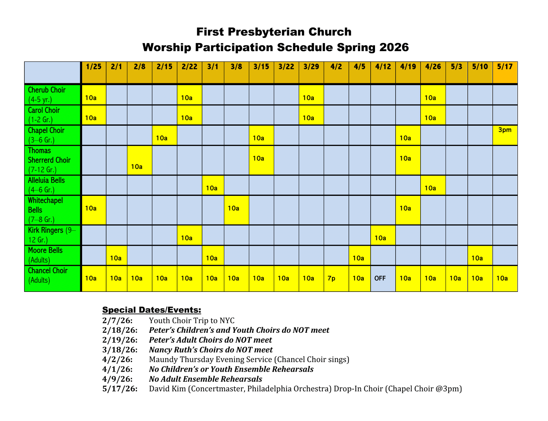 consists of children in 3rd through 6th grade. Chapel singers rehearse in Fellowship Hall each Wednesday from 4:00 – 4:30 p.m., beginning in September.